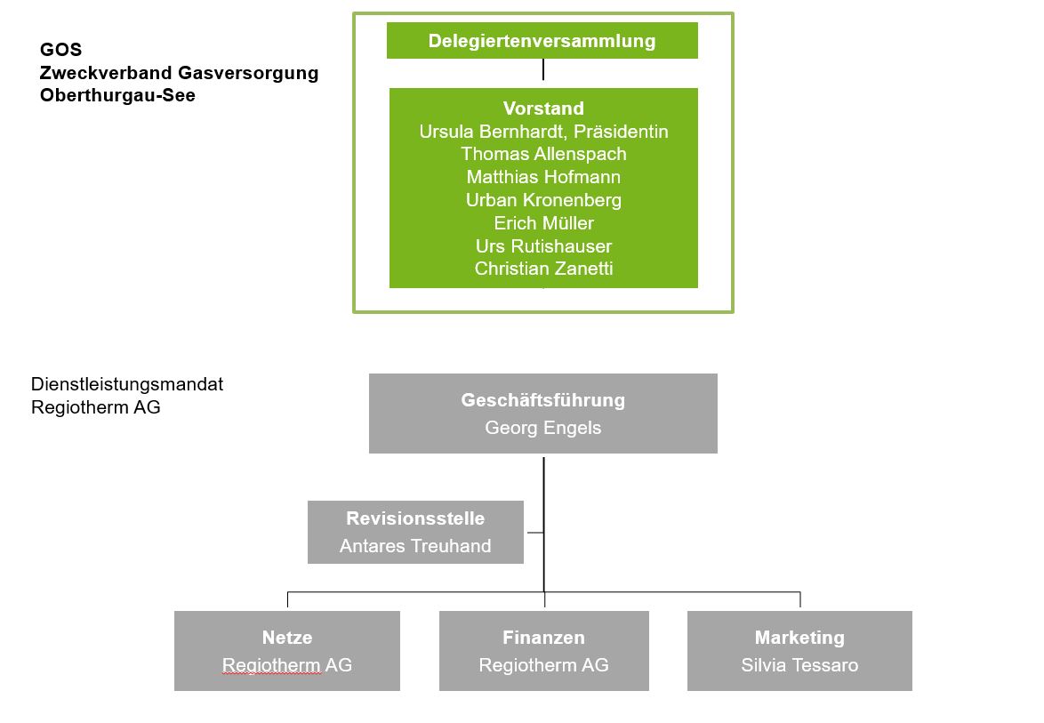 Für den optimalen Betrieb des Erdgas-Transportnetzes haben sich 14 Gemeinden des Oberthurgau und der Seeregion zu dem Zweckverband Gasversorgung Oberthurgau-See (GOS) zusammengeschlossen. Die Regiotherm AG (RET) ist verantwortlich für die Geschäftsführung des Zweckverbands sowie für die regionale Vermarktung der Erdgas-Marke.